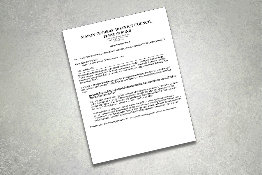 Please see the letter below from the Mason Tenders' District Council Pension Fund announcing the increase to the Pension for Local 78 members.