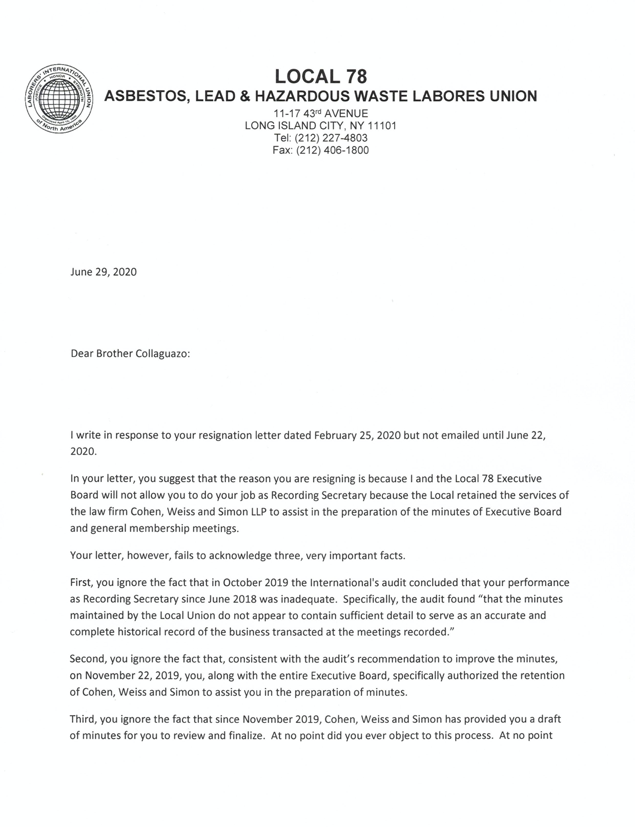 W swoim liście sugerujesz, że powodem Twojej rezygnacji jest to, że zarówno ja jak i Zarząd Local 78 nie zezwala Ci na wykonywanie Twojej pracy na stanowisku protokolanta, z racji tego, że Local przedłużył współpracę z kancelarią prawną Cohen, Weiss and Simon LLP, która zajmuje się przygotowaniem protokołów ze spotkań zarządu oraz walnych zgromadzeń członków.