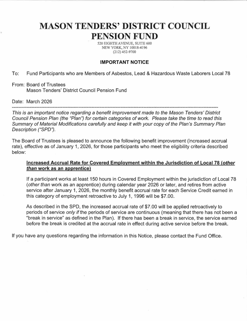 Notice to the Increase in Pension View Larger Image Please see the letter below from the Mason Tenders’ District Council Pension Fund announcing the increase to the Pension for Local 78 members. J2026-03-31T14:50:19+00:00March 31st, 2026| Get Social, Share This! FacebookXLinkedInTumblrEmail Related Posts Gallery Local 78 Christmas Party December 16th, 2025 | 0 Comments Gallery Local 78 Charitable Gala 2025 November 24th, 2025 Gallery Local 78 Memorial Mass November 15th, 2025 | 0 Comments Gallery Labor Day Parade September 12th, 2025 | 0 Comments Gallery Local 78 Family Day September 12th, 2025 | 0 Comments